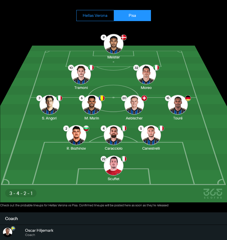 11 ตัวจริงคาดการณ์ เวโรน่า (3-5-2)