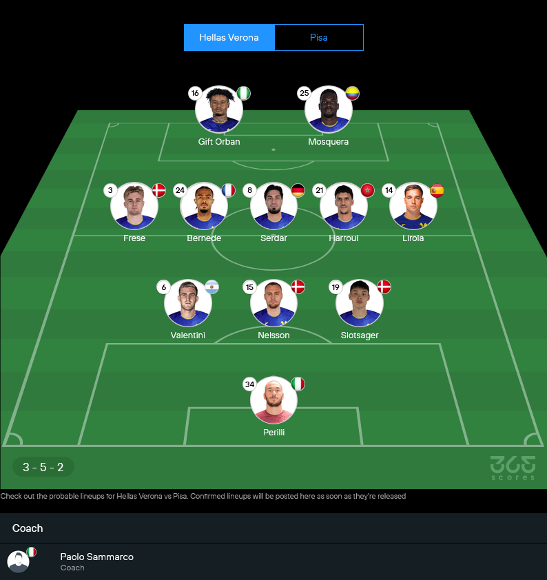ภาพรวมเจ้าถิ่นช่วงนี้หนักจริง ไม่ชนะต่อเนื่องจนต้องมีการเปลี่ยนมือคุมทีม ตอนนี้เป็นยุคของ เปาโล ซัมมาร์โก เข้ามาขัดตาทัพ ความหมายคือระบบจะเน้นรัดกุมขึ้น เล่นแบบไม่ผลีผลาม และพยายามทำเกมให้เป็นทรงมากกว่าเดิม ข่าวร้ายคือมีตัวแบนชัด ๆ อย่าง อามิน ซาร์ (กองหน้า) ส่วนตัวเจ็บ/ไม่สมบูรณ์ก็มีหลายราย ทำให้การจัดทัพต้องเลือกคนที่ “ฟิตไว้ก่อน” แล้วค่อยว่ากันเรื่องความหวือหวา ในมุม วิเคราะห์บอล GOALSIAM มองว่าเวโรน่าน่ามาแผน 3-5-2 ตามทรงที่เห็น เพื่อคุมแดนกลางให้แน่น แล้วให้คู่หน้าไล่บี้สร้างความปั่นป่วน