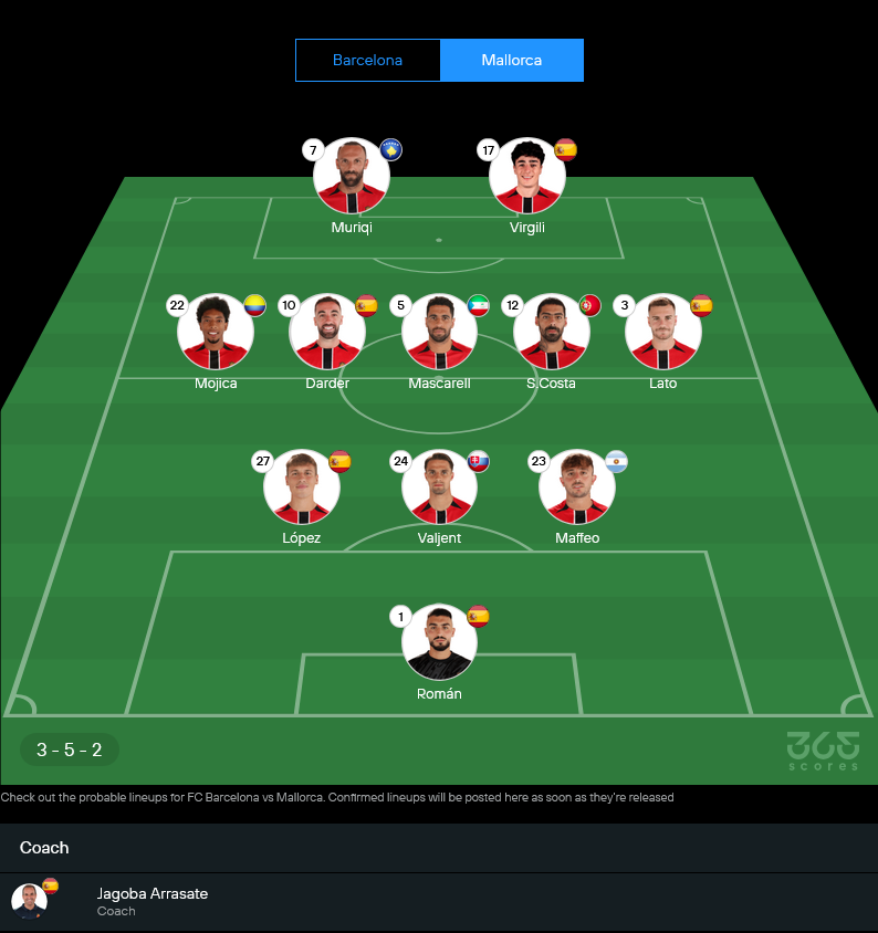 ฝั่งมายอร์ก้า ภายใต้การคุมทีมของ ฆาโกบา อาร์ราซาเต้ สภาพทีมถือว่าโอเคพอสมควร มีแข้งเจ็บยาวอยู่ 2 รายคือ มาราช คุมบูลล่า กับ ทาคุมะ อาซาโนะ ที่ยังไม่พร้อมลงสนาม ทำให้เกมนี้ไม่น่าฝืนลองเสี่ยง ใช้แผนถนัด 3-5-2 ดึงเกมลงต่ำ รอวางบอลยาวให้ เวดัต มูริกี้ ยืนค้ำคู่กับ ยาน บิร์กิลี่ คอยเล่นลูกกลางอากาศและพักบอลให้เพื่อนเติม ขณะที่แดนกลางมี โอริโอล โรเมอู มาสกาเรล กับ ซามู คอสต้า ยืนคุมจังหวะร่วมกับ เซร์จี้ ดาร์เดร์ ส่วนริมเส้นให้ โยอัน โมฮิก้า กับ โทนี่ ลาโต้ ขึ้นลงสองฝั่ง