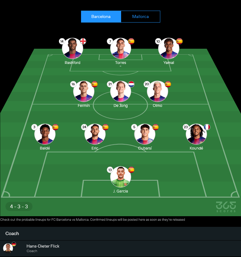 ฮันส์ ดีเทอร์ ฟลิค ยังต้องขาดสามแกนหลักอย่าง เปดรี, ปาโบล กาบี และ อันเดรียส คริสเตนเซ่น ที่เจ็บยาวทั้งหมด รวมถึงรอเช็กฟิต ราฟินญ่า ปีกขวาจอมลากเลื้อย แต่ภาพรวมสภาพทีมยังแน่น เพราะตัวแทนในแต่ละตำแหน่งทำผลงานได้เนียนไม่แพ้กัน แผนหลักใช้ระบบ 4-3-3 เปิดเกมรุกเต็มตัว แดนหน้าจัด มาร์คัส แรชฟอร์ด ยืนฝั่งซ้าย เฟร์ราน ตอร์เรส ยืนหน้าเป้า และดาวรุ่งไฟแรง ลามีน ยามาล ลากเลื้อยทางขวา กลางสนามมี เฟรงกี้ เดอ ยอง คุมจังหวะร่วมกับ เฟร์มิน โลเปซ และดานี่ โอลโม่ ส่วนแนวรับใช้คู่เซ็นเตอร์ เอริค การ์เซีย จับคู่ เปา คูบาร์ซี่ มี จูลส์ คุนเด้ กับ อเลฆานโดร บัลเด้ ยืนฟูลแบ็ก