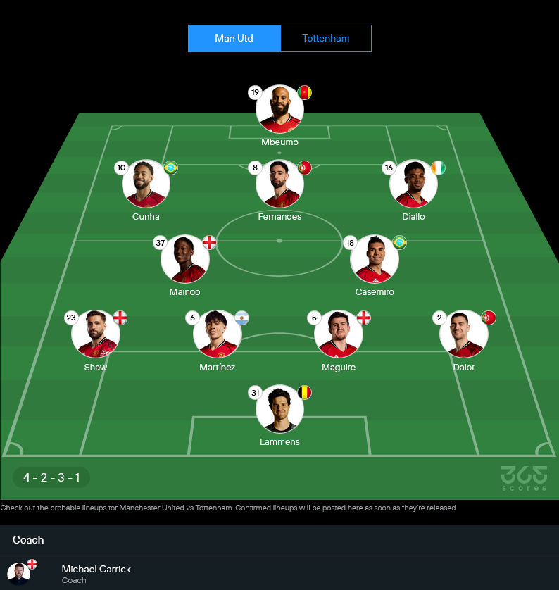 ปีศาจแดงของไมเคิล คาร์ริค สภาพทีมถือว่าโอเค เจ็บหลักๆ มี มัตไธย์ส เดอ ลิกต์ กับ พาทริค ดอร์กู ที่ยังพักยาว ส่วน เมสัน เม้าต์ โดนกระแทกศีรษะเล็กน้อย น่าจะมีชื่อแค่สำรองหรืออาจพักเต็มเกม ทำให้โครงสร้างหลักของทีมยังอยู่กันครบ