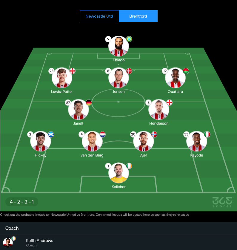 ฝั่ง เบรนท์ฟอร์ด ของกุนซือ คีธ แอนดรูว์ สภาพทีมก็ไม่สมบูรณ์เหมือนกัน ตัวเจ็บยาวทั้ง อันโทนี่ มิลัมโบ, ฟาบิโอ คาร์วัลโญ่ และ โจชัว ดาซิลวา แถมยังเสีย เควิน ชาเดอ ที่ติดโทษแบนจากใบแดงนัดล้มวิลล่า ส่วน ริโก้ เฮนรี่ แบ็กซ้ายตัวหลักยังต้องเช็กฟิต ใครจะลงยืนฝั่งซ้ายต้องลุ้นกันก่อนประกาศรายชื่อจริง