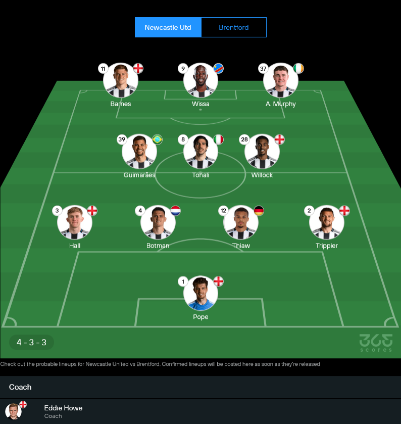 อย่างไรก็ดี โครงหลักยังจับเอา นิค โป๊ป เฝ้าเสา แบ็กโฟร์วาง ลูอิส ฮอลล์ ยืนซ้าย, สเวน บ็อตมัน จับคู่ มาลิค เธียว ตรงกลาง และ คีแรน ทริปเปียร์ ประจำการฝั่งขวา ส่วนแดนกลางคาดว่าจะใช้ ซานโดร โตนาลี่ คุมจังหวะร่วมกับ โจ วิลล็อค และ เจค็อบ แรมซีย์ สามประสานแนวรุกฝากความหวังไว้ที่จังหวะเข้าทำของ ฮาร์วี่ย์ บาร์นส์, ไบรอัน เอ็มเบวโม่…ไม่ใช่ แต่เป็น โยอาน วิสซ่า ที่ถูกดันมายืนหน้าเป้า และ อ็องดรูว์ เมอร์ฟี่ย์ ทางฝั่งขวา