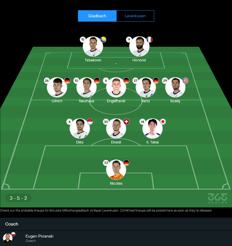 แผนที่คาดว่าจะใช้ยังเน้น 3 เซ็นเตอร์แบ็ก ยืนระบบ 3-5-2 เน้นปิดพื้นที่แดนกลางให้แน่น แล้วฝากความหวังในการจบสกอร์ไว้ที่คู่หัวหอก Tabakovic กับ Honorat โดยใช้ Neuhaus, Engelhardt และ Reitz เป็นสามมิดฟิลด์คอยคุมจังหวะเกม ส่วน Scally กับ Ullrich โดนสั่งเติมเกมด้านข้างให้สุดเส้น