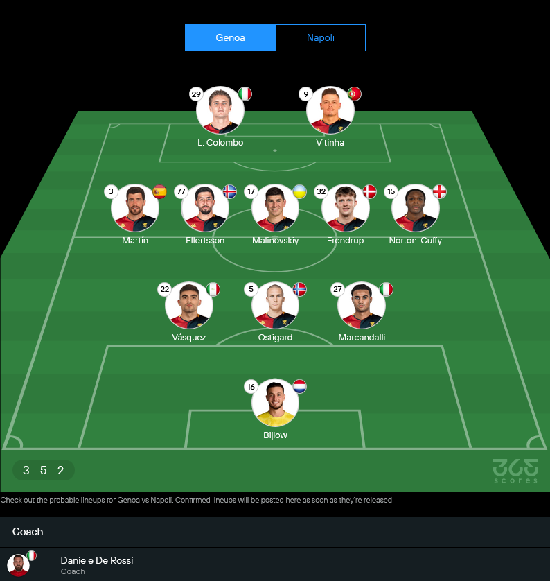 เจนัวของเด รอสซีปีนี้เน้นเกมรุกมันส์ๆ แถมขุมกำลังก่อนเกมนี้ถือว่าค่อนข้างพร้อม มีตัวเจ็บหลักๆ แค่ เบนจามิน ซีกริสต์ ที่พักยาว และ ทอมมาโซ บัลดันซี ที่ยังต้องเช็กฟิต แต่ไม่ได้กระทบโครงสร้างทีมหลักมากนัก รูปแบบการยืนเกมนี้ใช้ 3-5-2 เหมือนเดิม เน้นกลางสนามแน่นๆ แล้วปล่อยคู่หน้าทำงาน