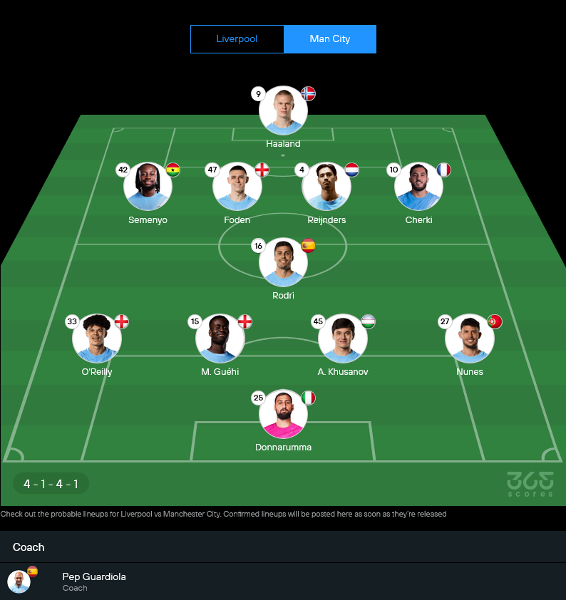เป๊ปน่าจะจัด 4-1-4-1 เน้นคอนโทรลเกมกลางสนาม โรดรี้ ยืนต่ำหน้าคู่เซ็นเตอร์ เปิดทางให้แถวบนอย่าง เซเมนโย่, โฟเด้น, เรย์นเดอร์ส และ แชร์กี้ เดินเกมรุกหลากหลาย ปล่อย ฮาลันด์ ยืนค้ำลุ้นจบสกอร์ในกรอบเขตโทษเหมือนเดิม