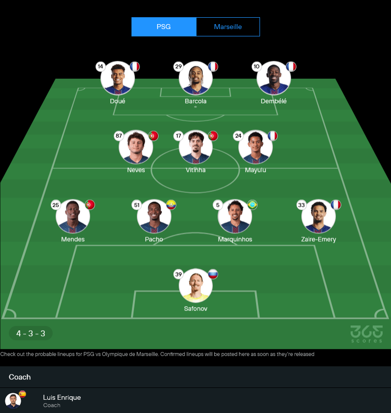 เปแอสเชของหลุยส์ เอ็นรีเก้ยังยึด 4-3-3 เปิดเกมบุกเต็มสูบ ใช้แนวรุกดาวรุ่งความเร็วสูงป่วนหลังมาร์กเซย ข้อเสียคือต้องขาดตัวทีเด็ดหลายคน
