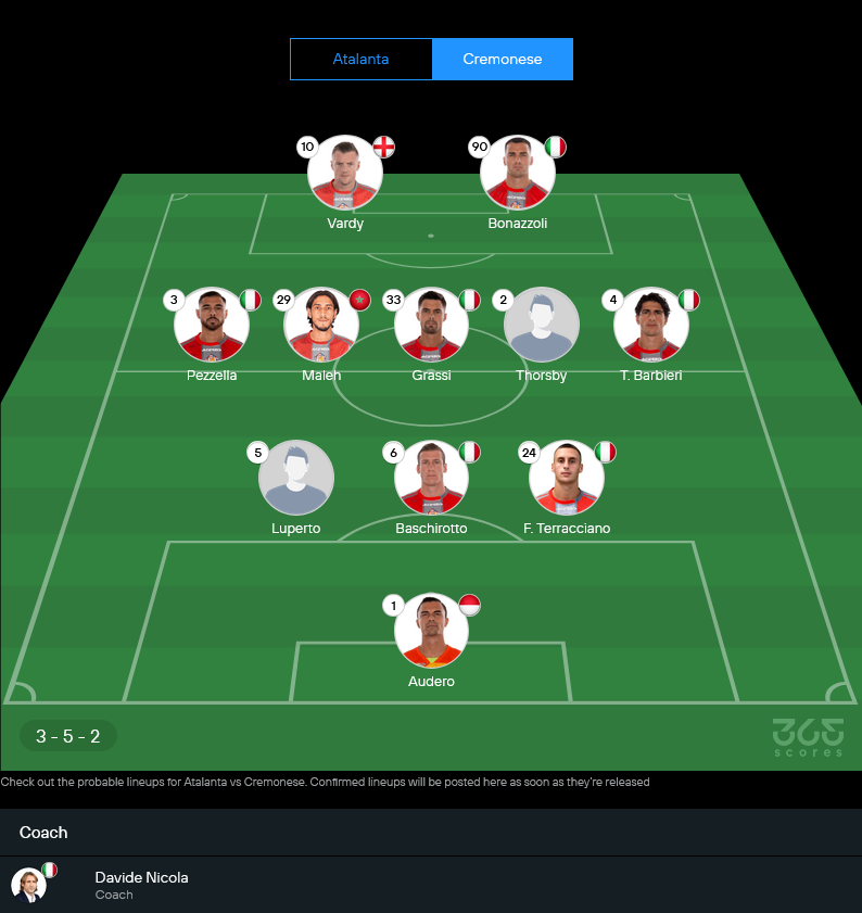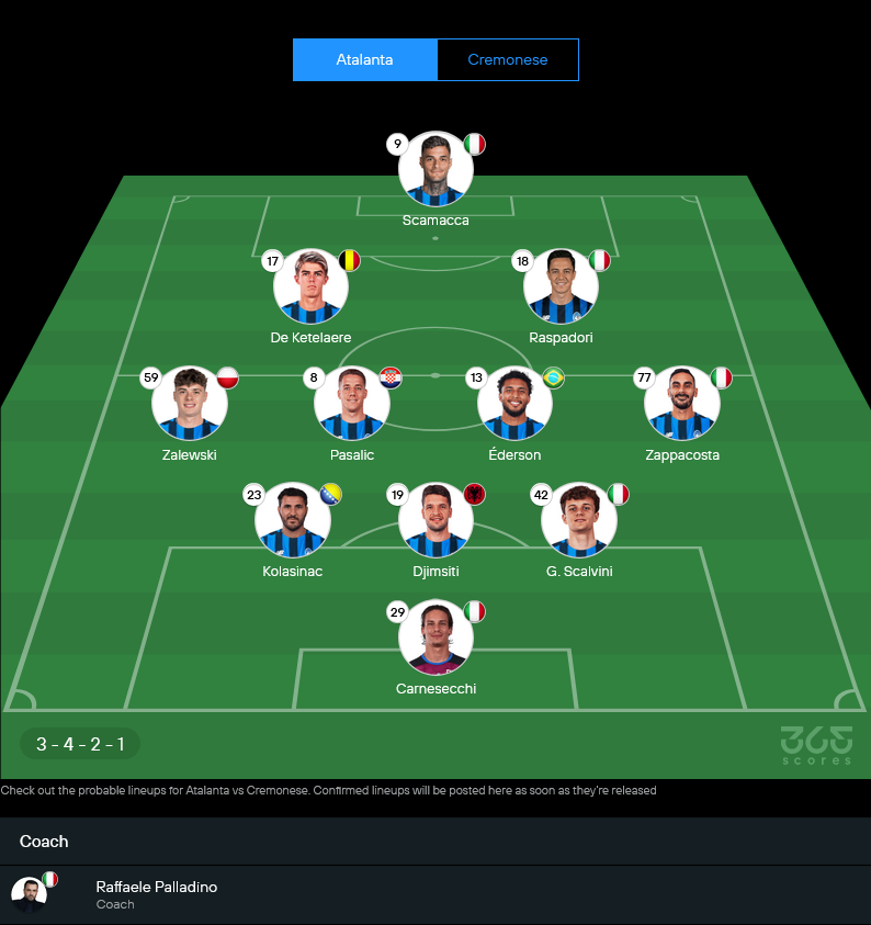 ฝั่งเจ้าถิ่นของกุนซือ ราฟฟาเอเล่ ปัลลาดิโน่ สภาพทีมมีข่าวดีข่าวร้ายปนกันไป จุดที่ต้องระวังคือการขาดสองตัวหลักในโซนกลางและแนวรับอย่าง มาร์เทน เดอ รูน กับ ฮอนเนสต์ อาฮานอร์ ที่ติดโทษแบนทั้งคู่ ขณะที่ มิทเชล บัคเกอร์ ยังเดี้ยงยาวต่อเนื่อง แต่ภาพรวมยังถือว่าขุมกำลังแน่น แนวรุกนำโดยสามประสานอย่าง เดอ เคเตแลเร่, ราสปาโดรี่ และ สคามัคก้า ที่เพิ่งกดฟอร์มโหดใส่ยูเวนตุสหมาดๆ