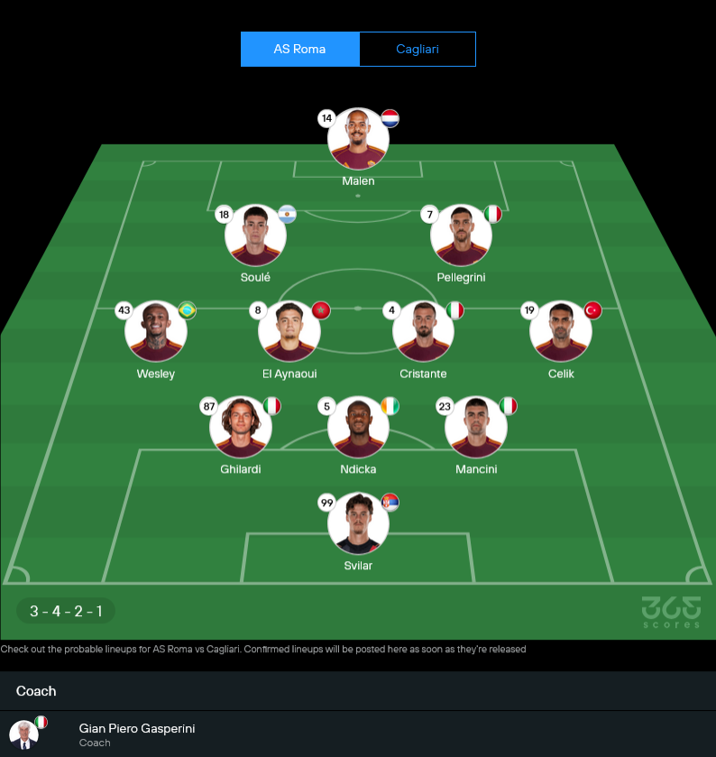 ฝั่งเจ้าบ้าน กาสเปรินี่วางหมาก 3-4-2-1 ใช้ ไมล์ สวิลาร์ ยืนเฝ้าเสา แนวรับสามคนมี กิลาร์ดี้ – เอวาน เอ็นดิกก้า – จานลูก้า มันชินี่ ขนาบข้างด้วยวิงแบ็ก เวสลีย์ ทางซ้าย และ เซกี้ เชลิค ทางขวา กลางคู่ใช้ นีล เอล อัยนาอุย ยืนคู่กับ ไบรอัน คริสตานเต้ คอยตัดเกมและคุมจังหวะ ส่วนสองตัวรุกด้านหลังหน้าเป้าเป็น มาติอัส ซูเล่ กับ ลอเรนโซ่ เปเยกรินี่ ทำเกมหนุน ดอนเยลล์ มาเลน หัวหอกดัตช์ที่สปีดจัดจ้านค้ำแดนหน้า