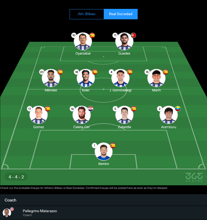ฝั่งเจ้าบ้านของโค้ช เอร์เนสโต้ บัลเบร์เด้ เกมนี้จัด 4-2-3-1 ตามสไตล์ถนัด เน้นเพรสซิ่งดุดันหน้าเขตโทษคู่แข่ง แล้วค่อยเปลี่ยนสปีดขึ้นเกมริมเส้น คู่หูตระกูลวิลเลียมส์พร้อมลากเลื้อยใส่หลังบ้านโซเซียดาดเต็มที่