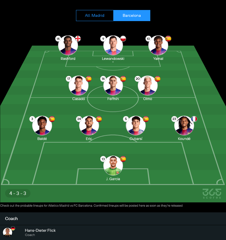 ฮานส์ ดีเทอร์ ฟลิค มากับระบบ 4-3-3 ตามถนัด เน้นครองบอลและไล่บีบคืนเร็ว จุดสำคัญคือยังไม่มีเปดรี้กับกาบีที่เจ็บยาวอยู่แล้ว รวมถึงราฟินญาที่ต้องเช็กฟิต ส่วนเฟรงกี้ เดอ ยอง และอันเดรียส คริสเตนเซน ยังอยู่ในกลุ่มเสี่ยงเรื่องสภาพร่างกาย แต่ข่าวดีคือแกนหลักอย่างเลวานดอฟสกี้, ดานี โอลโม่ และยามาล พร้อมประจำการ