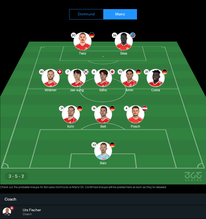 ระบบที่ใช้ยังคง 3-5-2 เน้นวิ่งสู้ฟัดกลางสนาม ดาเนียล บัตซ์ ยืนเฝ้าเสา สามปราการหลังเป็น โดมินิค คอห์ร, สเตฟาน เบลล์ และ สเตฟาน พอช วิงแบ็กสองฝั่งใช้ ซิลวาน วิดเมอร์ กับ แดนนี่ ดา คอสต้า กลางสามตัวคือ อี แจ ซอง, ไคชู ซาโนะ และ นาเดียม อามิรี เพลย์เมกเกอร์ตัวหลักที่ซัดไปแล้ว 9 ลูกในลีก ส่วนแดนหน้าจัด ฟิลลิป ทีตซ์ ยืนคู่ ซิลาส คู่หูหน้าใหม่ที่เพิ่งมาลงล็อกพร้อมกัน
