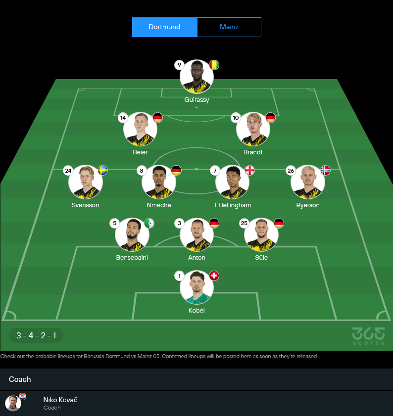 อย่างไรก็ดี โควัชยังยึดระบบ 3-4-2-1 เน้นครองบอลบุกใส่คู่แข่งเหมือนเดิม มี เกรกอร์ โคเบล เฝ้าเสา แผงหลังใช้ นิคลาส ซูเลอ, วัลเดมาร์ อันตอน และ รามี่ เบนเซไบนี่ ขยับขึ้นมาที่วิงแบ็กเป็น ดาเนียล สเวนส์สัน กับ ยูเลียน ไรเออร์สัน คู่กลางใช้ เฟลิกซ์ เอ็นเมช่า ประสานงานกับ เจ โจ๊บ เบลลิ่งแฮม ส่วนสองตัวรุกด้านหลังหน้าเป้าเป็น มักซิมิเลียน ไบเออร์ กับ ยูเลียน บรันด์ คอยซัพพอร์ต เชรูว์ กีราสซี่ ที่กำลังไล่ล่าประตูที่สองหลักของตัวเอง