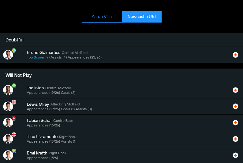 | 26/12/2024 | Premier League | Newcastle United 3-0 Aston Villa |