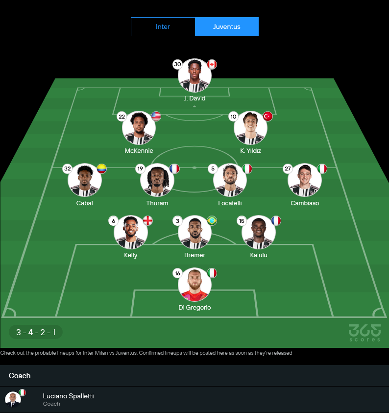 ฝั่งยูเว่ ฟอร์มภาพรวมถือว่าดีเช่นกัน เกมลีกสองนัดหลังยิง 7 ประตู เสมอลาซิโอแบบสุดดราม่าด้วยลูกตีเสมอนาที 96 ของ ปิแอร์ คาลูลู ให้ทีมไม่แพ้ในบ้านต่อเนื่อง ส่วนเกมเยือนแม้มีสะดุดแพ้อตาลันต้าในบอลถ้วย แต่เวลาลงสนามในลีกยังเล่นได้มั่นใจ โดยเฉพาะแผงรุกที่มี โจนาธาน ดาวิด ยืนห้อยหน้า พร้อมด้วยตัวสนับสนุนอย่าง เวสตัน แม็คเคนนี่ และ เคนาน ยิลดิซ ที่กำลังมั่นใจ ยิงใส่อินเตอร์มาแล้วหลายครั้ง