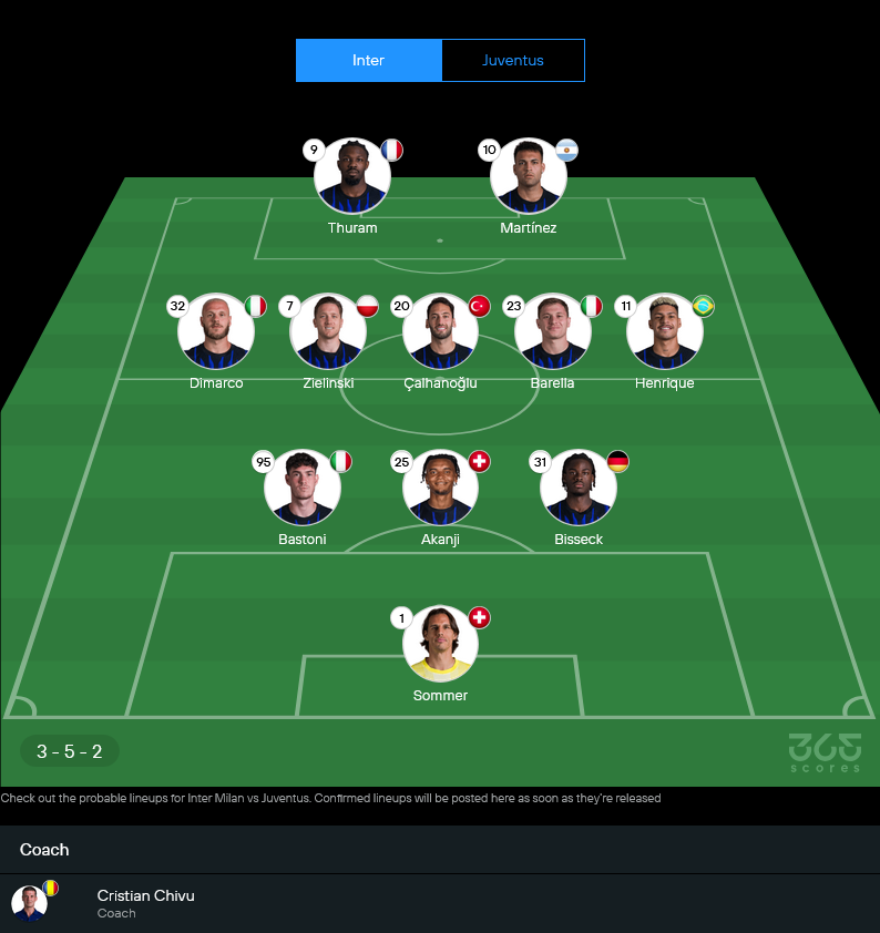 อินเตอร์ยังคงใช้ระบบ 3-5-2 เน้นคุมเกมกลางสนามและเติมจากวิงแบ็กสองฝั่ง กองหลังสามตัวอย่าง บาสติโอนี่ – อคันจี – บิสเซ็ค เล่นกันรู้ใจ ข้างหน้าใช้คู่หู ตูราม – เลาตาโร่ เหมือนเดิม