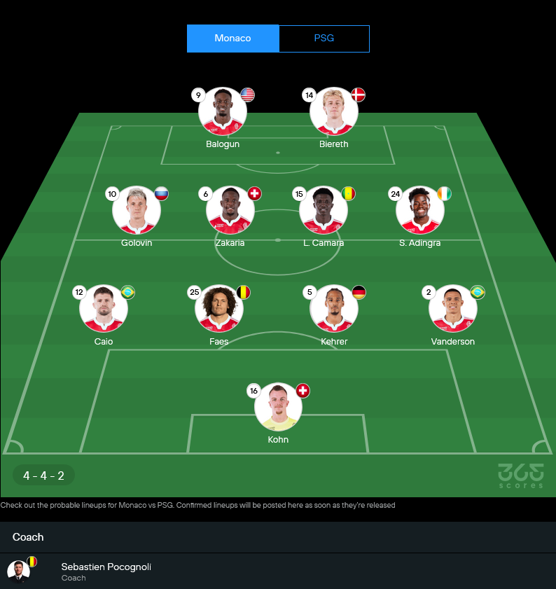 ขุมกำลังเจ้าบ้านภายใต้การคุมทัพของ เซบาสเตียง ปอคโนลี่ จัดมาในระบบ 4-4-2 เน้นเกมโต้กลับเร็ว ตัวหลักในเกมรุกอยู่กันครบทั้งคู่หน้า บาลูกัน กับ เบียร์เร็ธ ส่วน อเล็กซานเดอร์ โกโลวิน ที่โดนไล่ออกในลีก ยังลงเล่นยุโรปได้สบายๆ ด้านตัวเจ็บมีเยอะพอสมควร ตั้งแต่ ลูคัส เฮราเด็คกี้, ทาคุมิ มินามิโนะ, โมฮัมเหม็ด ซาลิซู ที่เดี้ยงยาวเข่า รวมถึง กัสซูม อูอัตตาร่า, เอริก ดายเออร์ และ ปอล ป็อกบา ที่เจ็บน่อง นอกจากนี้ เปป กาบราล ยังเจ็บกล้ามเนื้อ ส่วน ลามีน คาเมร่า กับ มักเนส อัคลิอูช ต้องรอเช็กฟิต แต่โดยรวมโครงหลักยังอยู่ครบ ทำให้ GOALSIAM มองว่าแผนเกมรับคุมโซนกลางสนามยังพอแน่นอน