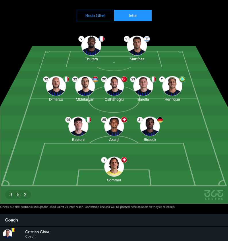 ฝั่งทีมเยือน ภายใต้การนำของ คริสเตียน คิวู สภาพทีมถือว่าดูดีขึ้นเรื่อยๆ ตัวหลักทยอยหายเจ็บกลับมาเกือบครบ มีเพียง เดนเซล ดุมฟรีส์ ที่ยังเดี้ยงยาว ส่วนโครงสร้างทีมยังยึดระบบ 3-5-2 เน้นเกมรับแน่น โต้กลับดุดัน แดนกลางใช้ ฮาคาน ชัลฮาโนกลู ประสานงานกับ นิโคโล่ บาเรลล่า และ ปิโอตอร์ ซีลินสกี้ คอยคุมจังหวะให้สองหัวหอกอย่าง มาร์คุส ตูราม กับ เลาตาโร่ มาร์ติเนซ ปิดบัญชี