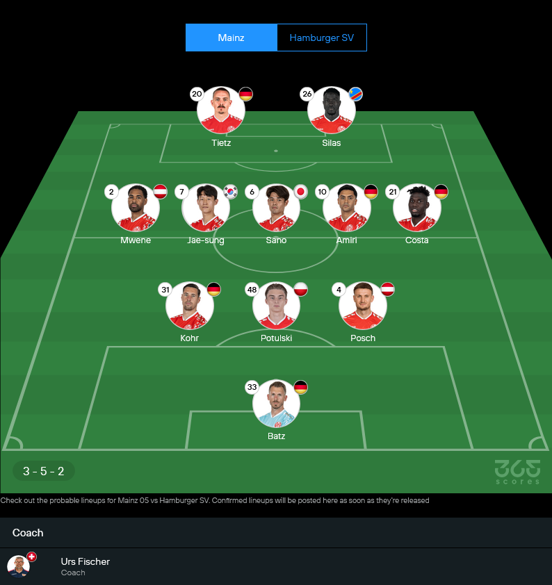 ไมนซ์เจอปัญหาตรงๆคือแนวรับโดนกระทบจากตัวเจ็บและตัวแบน แถมในลิสต์ยังมีพวกสถานะเช็กฟิตอีกหลายราย ทำให้การยืนไลน์รับอาจต้องปรับจูนกันใหม่ อย่างไรก็ดี แผนที่คาดว่าจะใช้ยังเป็น 3-5-2 ที่เน้นวิงแบ็คเติมสูงและให้กองกลางคุมเกม ถ้าวันไหนคุมจังหวะได้ ไมนซ์จะบุกเป็นชุดๆแบบไม่พัก นี่แหละจุดที่ทำให้คู่นี้น่าเล่น เพราะทรงมันเปิดหน้าแลกได้ ไม่ใช่เกมอุดแบบน่าเบื่อ