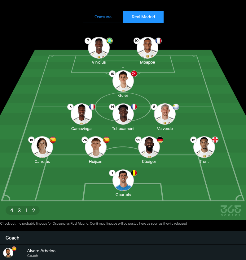 มาดริดมีตัวเจ็บชัด ๆ อย่าง เอแดร์ มิลิเตา กับ จู๊ด เบลลิงแฮม ส่วนชื่อชูอาเมนี่มีสถานะไม่สมบูรณ์ แต่ก็ยังมีลุ้นได้เห็นลงเพราะถูกวางไว้ในโผตัวจริงเช่นกัน ระบบน่าจะมา 4-3-1-2 วางกูแลร์เป็นตัวปั้นเกมให้สองคมหน้าอย่างวินิซิอุสกับเอ็มบัปเป้ เล่นกันแบบ “มีคนจ่าย มีคนจบ” ครบสูตร