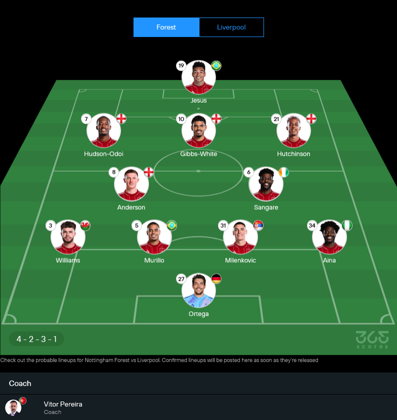 ฟอเรสต์เจอปัญหาตัวเจ็บหลายจุดเหมือนกัน โดยเฉพาะแนวรุกอย่าง คริส วูด ที่หายไปทำให้หน้าเป้าต้องพึ่ง อิกอร์ เชซุส แบบเต็มตัว ส่วนมือหนึ่งอย่าง แม็ตซ์ เซลส์ ยังไม่พร้อม ทำให้ สเตฟาน ออร์เตก้า ได้ยืนต่อเนื่อง เกมนี้ภาพรวมถือว่า “พร้อมสู้” แต่ความสดเป็นคำถาม เพราะเพิ่งผ่านเกมยุโรปมาไม่นาน