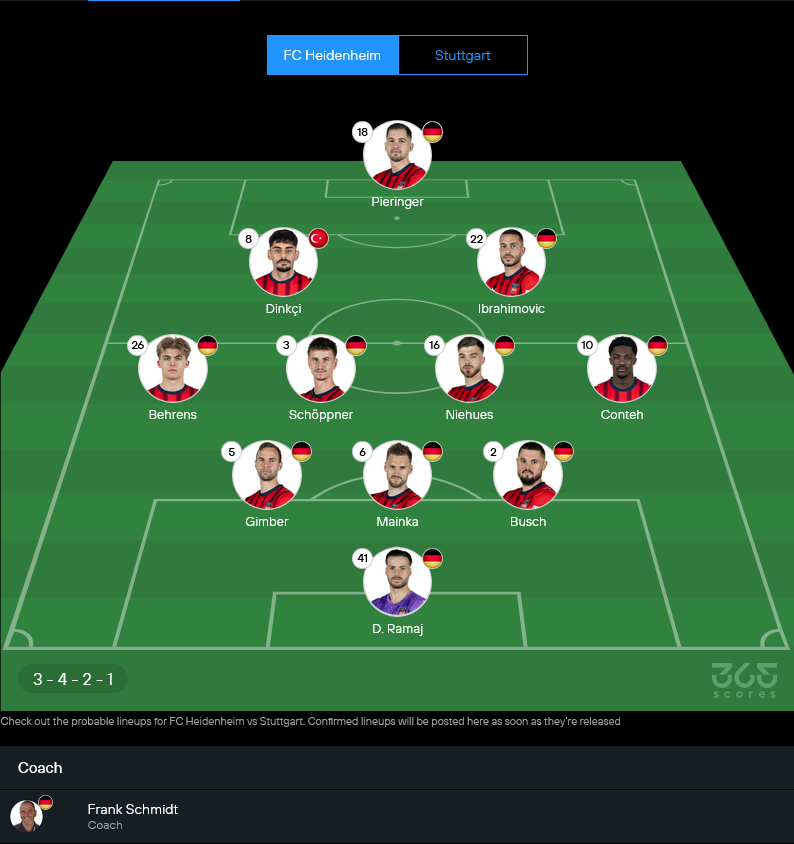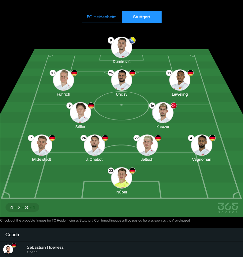 สตุ๊ตการ์ทมีขาดอยู่เหมือนกัน โดย Dan-Axel Zagadou เจ็บ ส่วน Justin Diehl และ Lazar Jovanovic ก็ไม่พร้อม ชุดนี้เลยน่าจะจัดตัวรุกแกนหลักที่กำลังเข้าฟอร์มลงครบ เน้นคุมแดนกลางแล้วค่อยๆเร่งสปีด เกมนี้เซบาสเตียน เฮอเนสส์น่าจะเลือกแผน 4-2-3-1 ที่บาลานซ์ดี มีทั้งคุมเกมและจบสกอร์ ความอันตรายอยู่ที่แนวรุกสลับตำแหน่งกันไว ทำให้ไฮเดนไฮม์หลุดโซนง่าย