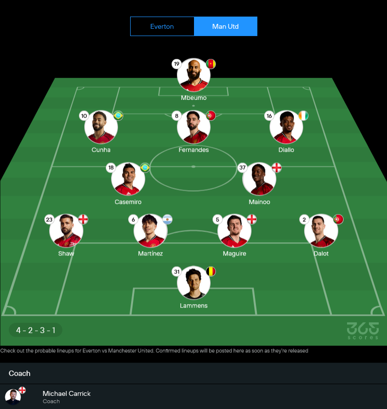 คาร์ริคคงยึด 4-2-3-1 เหมือนกัน โดยวาง เอ็มโบโม่ เป็นหน้าเป้า แล้วให้สามตัวรุกอย่าง ดิยัลโล่ บรูโน่ และคุนญ่าเป็นตัวปั้น เกมนี้กลางสนามอย่าง คาเซมิโร่ กับ ไมนู จะเป็นหัวใจในการคุมจังหวะ ถ้าคุมได้ แมนยูจะบุกเป็นคลื่นแน่นอน