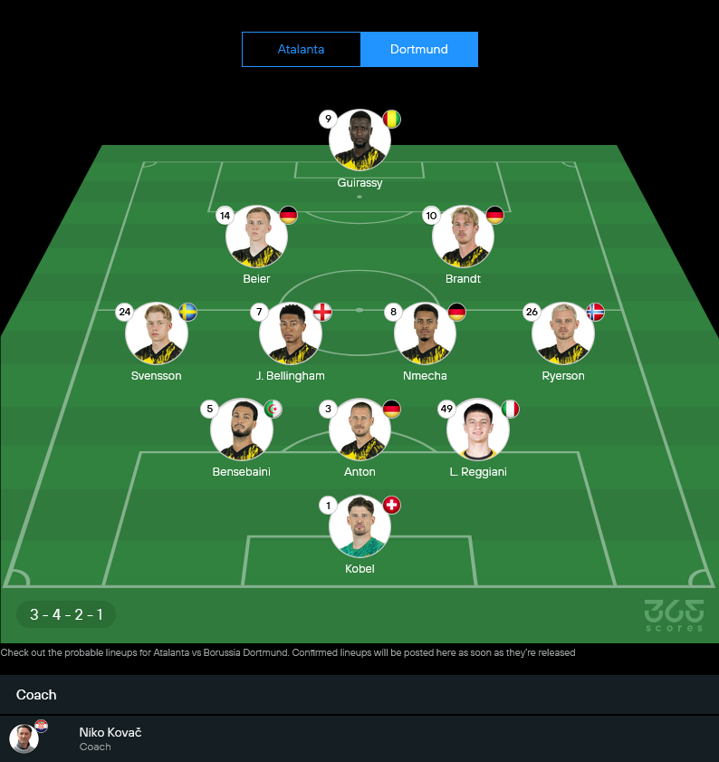 ดอร์ทมุนด์ของ นิโก้ โควัค เกมนี้สบายกว่าเยอะเพราะนำอยู่ 2-0 แถมฟอร์มรวมกำลังเข้าที่เข้าทาง แต่ก็มีปัญหาตัวเจ็บหลายราย โดยเฉพาะแนวรับบางตำแหน่งหายไป ทำให้ต้องปรับการยืนและการซ้อนเกมให้ละเอียดขึ้น อย่างไรก็ตาม ระบบ 3-4-2-1 ยังเป็นแกนหลัก เพราะมันทำให้ทีมคุมทรงเกมสวนกลับได้ดี มีวิงแบ็กช่วยพาบอลขึ้น และมีสองตัวรุกคอยเติมหลังหน้าเป้า