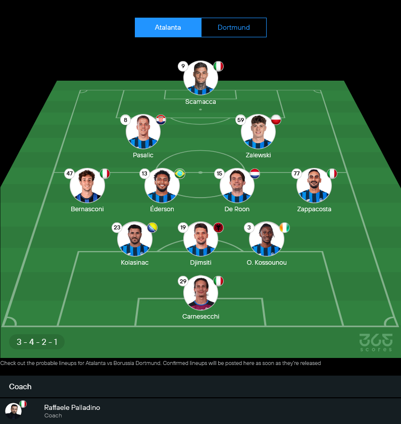 อตาลันต้าของ ราฟฟาเอเล่ ปัลลาดิโน่ คืนนี้เน้นสุด เพราะตามหลัง 2 ลูก เกมมันบังคับให้ต้องเร่งตั้งแต่ต้น แต่ก็ต้องบริหารจังหวะให้ดี ไม่ใช่บุกจนลืมระวังหลังบ้าน เรื่องตัวเจ็บยังมีให้ปวดหัว โดยเฉพาะแนวรุกที่หายไปบางราย ขณะที่แนวรับมีหนึ่งตัวที่ยังต้องเช็กสภาพ ก่อนจัดเต็มในระบบ 3-4-2-1 แบบยืนพื้น เน้นวิงแบ็กเติมสูง แล้วให้สองตัวรุกคอยหาช่องหลังไลน์