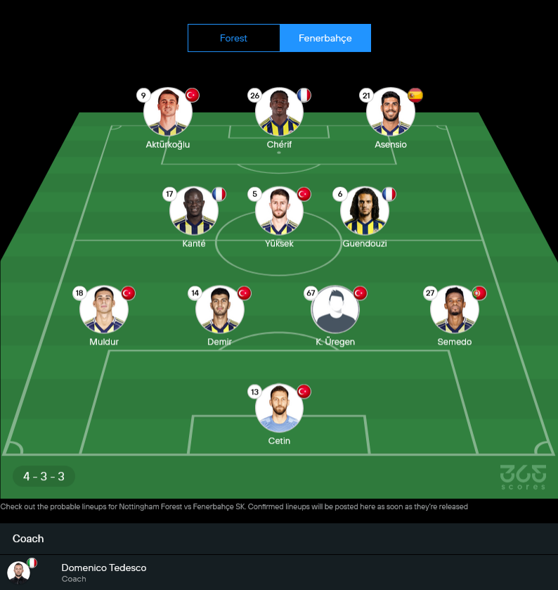 แนวคิดของเฟเนร์บาห์เช่เกมนี้ชัดเจน ต้องยิงให้ได้เร็วที่สุดอย่างน้อยหนึ่งลูกในครึ่งแรก เพื่อดึงความกดดันกลับมาหาเจ้าบ้าน พวกเขาจะใช้ประสบการณ์ของก็องเต้ควบคุมจังหวะกลางสนาม แล้วให้สามตัวบนเคลื่อนที่สลับตำแหน่งกดดันแผงหลังฟอเรสต์ตลอดเวลา