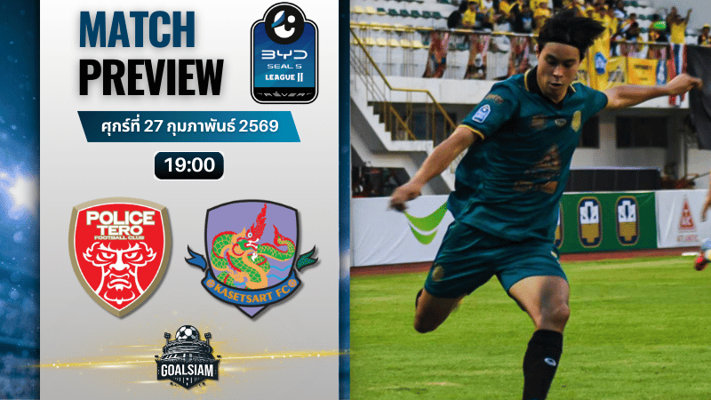 คืนนี้สายบอลลีกล่างห้ามกะพริบตา ศึก BYD SEAL 5 ลีกสอง คู่ดึกที่ NT Stadium โปลิศ เทโร เอฟซี เปิดบ้านรับมือ เกษตรศาสตร์ เอฟซี เกมนี้ไม่ใช่แค่บอลกลางตารางธรรมดา แต่เป็นแมตช์ชี้ทางอนาคตของทั้งสองทีมแบบชัดๆ ใครเก็บสามแต้มได้ มีสิทธิ์ขยับขึ้นไปยืนโซนบนอย่างมั่นคง ส่วนใครพลาดมีสิทธิ์รูดลงไปโดนกลุ่มหนีตกชั้นจี้ติดทันที