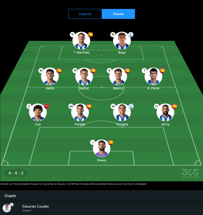 ฝั่งอลาเบสของ เอดูอาร์โด คูเดต น่าจะยึดระบบ 4-4-2 ที่กำลังเวิร์กต่อไป ความได้เปรียบคือสภาพทีมค่อนข้างสมบูรณ์ มีเพียง วิลเล คอสกี ที่ยังมีปัญหากล้ามเนื้อและสภาพไม่เต็มร้อย ถูกมองว่าไม่น่าฝืนลง ส่วนตำแหน่งอื่นๆ พร้อมลุยเกือบหมด