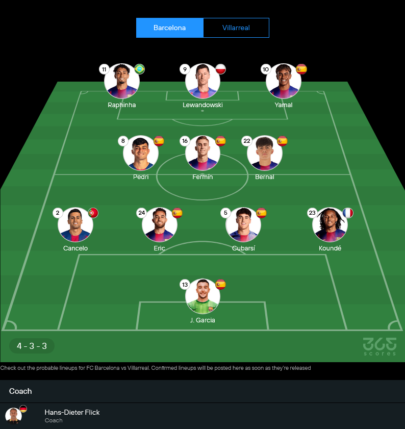 ทีมของ ฮันส์-ดีเทอร์ ฟลิค ยังขาด อันเดรียส คริสเตนเซ่น กับ เฟรงกี้ เดอ ยอง ที่เจ็บยาว ส่วน ปาโบล กาบี ยังต้องรอเช็คฟิต ขณะที่ เกราร์ด มาร์ติน ติดโทษแบน ทำให้แนวรับต้องใช้ เอริค การ์เซีย จับคู่กับ เปา คูบาร์ซี ส่วนแบ็กสองฝั่งเป็น เชา กานเชโล่ กับ ฌูลส์ คุนเด้ กลางสนามใช้สามหน่อ เปดรี, เฟร์มิน โลเปซ และ มาร์ก เบร์นัล ปั้นเกมอยู่ข้างหลังสามแนวรุก ราฟินญ่า, เลวานดอฟสกี้ และ ลามีน ยามาล ในระบบ 4-3-3 ที่เน้นครองบอลบุกเต็มสูบ