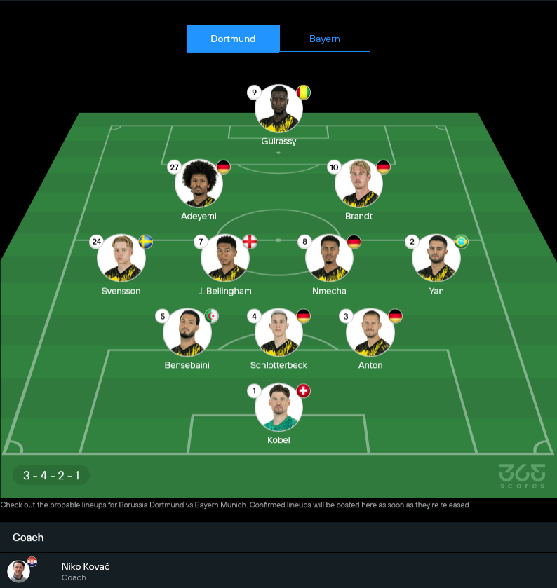 แท็คติกวันนี้ดอร์ทมุนด์ยืนระบบ 3-4-2-1 ตามสไตล์ โควัช เน้นเพรสสูงแล้วสวนกลับเร็ว แกนหลักวาง เกรกอร์ โคเบล เฝ้าเสา แผงหลังสามคนใช้ รามี่ เบนเซไบนี่, ชล็อตเตอร์เบ็ค (ถ้าผ่านฟิต) และ วัลเดมาร์ อันตอน กลางสองคนเป็น โจ๊บ เบลลิ่งแฮม จับคู่ เฟลิกซ์ เอ็นเมช่า โดยมี ดาเนียล สเวนส์สัน กับ ยาน คูโต้ ยืนวิงสองฝั่ง เกมรุกปล่อย คาริม อเดเยมี กับ ยูเลียน บรันด์ ปั้นเกมอยู่หลัง เชห์รู กีราสซี่ หอกตัวเป้า