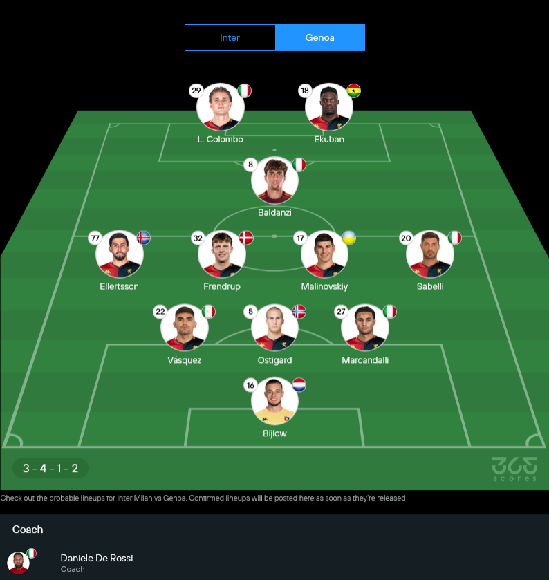 11 ตัวจริงเจนัว (คาดการณ์ระบบ 3-4-1-2)