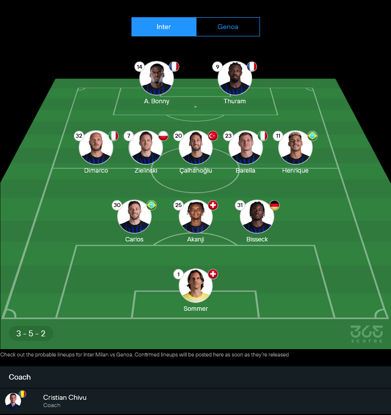 ดีที่ขุมกำลังที่เหลือยังแน่น ปิอโตร์ ซีลินสกี้, นิโคโล่ บาเรลล่า และเฟเดริโก้ ดิมาร์โก ยังยืนเป็นแกนหลัก ข้างหน้าคาดว่าจะดัน มาร์คุส ตูราม จับคู่กับ อังเก้-โยอัน บอนนี่ เน้นความเร็วและพละกำลังโจมตีแนวรับทีมเยือน ระบบคาดว่าใช้ 3-5-2 แบบเดิม เน้นครองเกม รุกจากวิงแบ็กซ้ายขวาเต็มรูปแบบ ซึ่งตรงนี้แหละคือจุดที่เราจะใช้คำว่า วิเคราะห์บอล ได้เต็มปากว่า อินเตอร์ยังดูครบเครื่องกว่าเยอะ