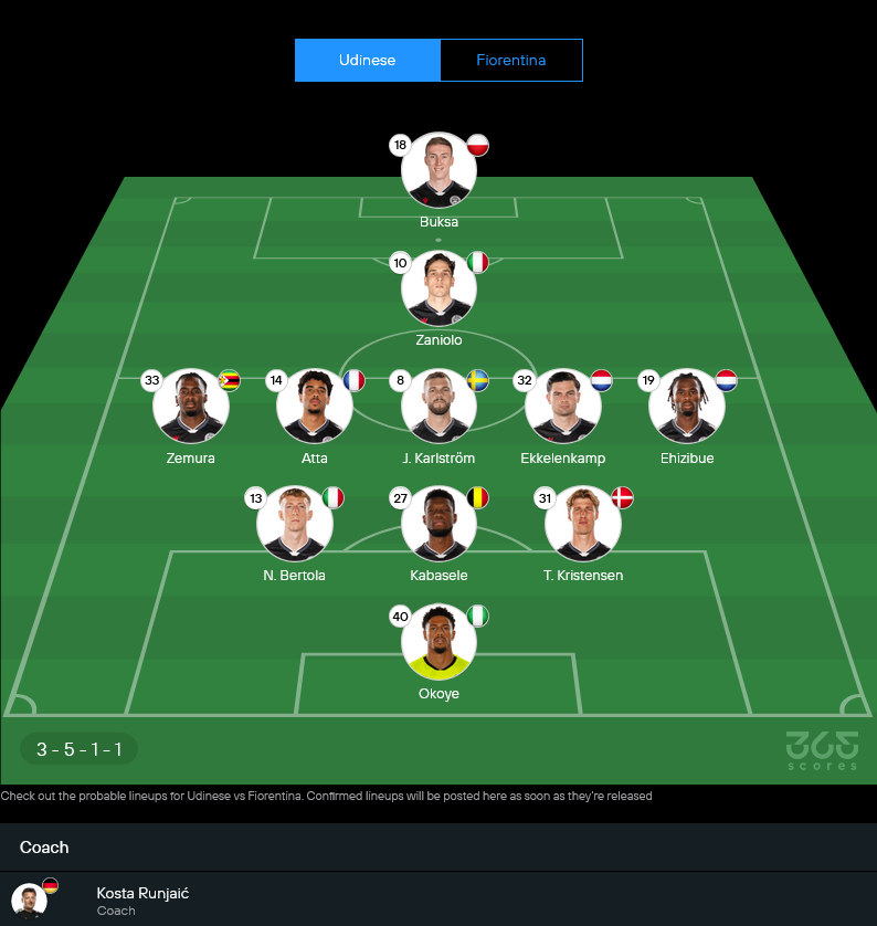 ฝั่งอูดิเนเซ่ กุนซือ Kosta Runjaić น่าจะยืนพื้นแผน 3-5-1-1 ตามทรงที่ใช้อยู่ เน้นคุมกลางให้แน่นแล้วออกบอลเร็วไปพื้นที่ว่าง จุดน่าจับตาคือบางรายชื่อมีสถานะไม่เต็มร้อย ทำให้เกมรับอาจต้องปรับหน้างาน