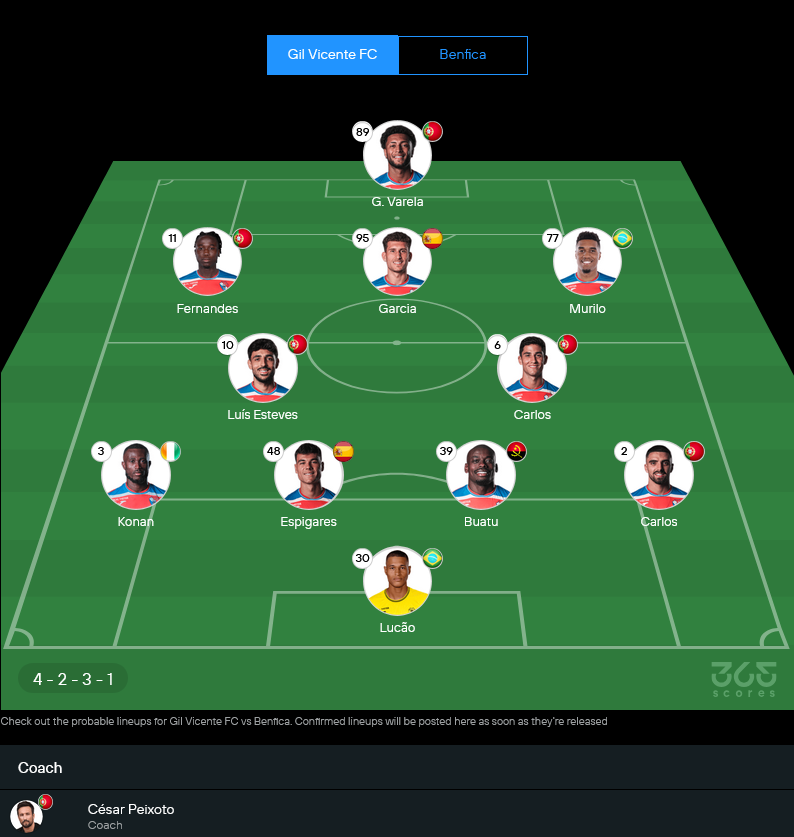เบนฟิก้าคาดว่าใช้ 4-2-3-1 เช่นกัน จุดเด่นคือมีตัวทำเกมตรงกลางที่คุมจังหวะได้ และแนวรุกหมุนตำแหน่งกันลื่นๆ โค้ชอย่างโชเซ่ มูรินโญ่ ถ้าได้โฟกัสลีกแบบเต็มตัว เกมแบบนี้มักมาเนี๊ยบ ไม่บ้าระห่ำ แต่จะค่อยๆ บีบจนคู่แข่งหายใจไม่ออก