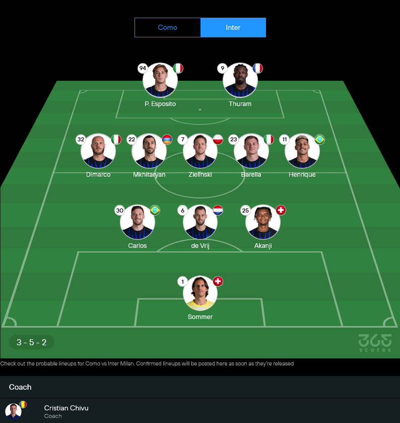 ฝั่งทีมเยือนของ คริสเตียน คิวู น่าจะยืนพื้น 3-5-2 ตามภาพรวมที่ถนัด เน้นวิงแบ็กดันสูงแล้วบีบพื้นที่กลางสนาม ข่าวที่กระทบชัดสุดคือ เลาตาโร มาร์ติเนซ ยังไม่พร้อม ทำให้เกมรุกต้องฝากความหวังไว้ที่ ตูราม กับดาวรุ่งอย่าง ปิโอ เอสโปซิโต้ มากขึ้น แต่ข้อดีคือแดนกลางอินเตอร์คุณภาพแน่นอยู่แล้ว ถ้าคุมจังหวะได้ อินเตอร์จะค่อยๆ บีบจนเจ้าบ้านหายใจไม่ทัน