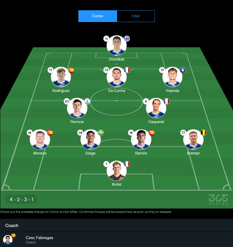 เจ้าบ้านของ เชส ฟาเบรกัส มาในทรงทีมที่เล่นบอลเป็นระบบ กล้าครอง กล้าสวน และที่สำคัญคือโมเมนตัมกำลังดี เกมนี้คาดว่าจะยึดแผน 4-2-3-1 ตามถนัด เน้นสองมิดฟิลด์คุมโซนแล้วปล่อยสามตัวรุกเล่นอิสระ จุดที่แฟนโคโม่ต้องภาวนา คืออย่าเสียบอลหน้าเขตตัวเองบ่อย เพราะอินเตอร์แค่ได้จังหวะเดียวมันลงโทษคมมาก