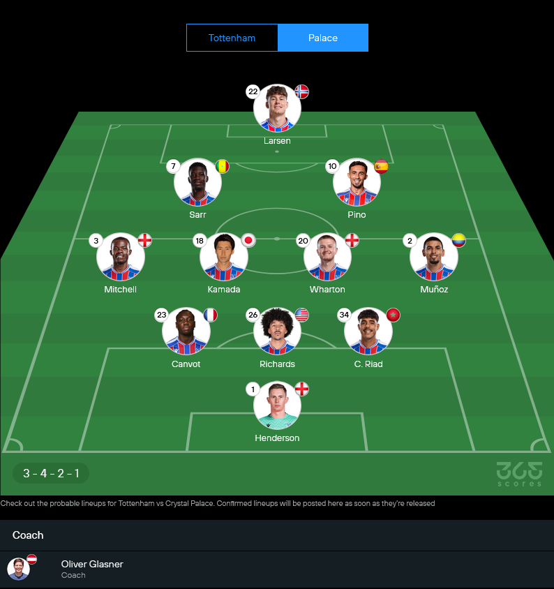 พาเลซก็มีตัวหายเหมือนกัน โดยเฉพาะแนวรับ มักซ็องซ์ ลาครัวซ์ ติดโทษแบน รวมถึงตัวเจ็บอย่าง เลอร์มา, มาเตต้า และ เอ็นเคเตียห์ ทำให้เกมรุกต้องจัดชุดให้ลงล็อกกับระบบ แต่ข้อดีคือแผนของกลาสเนอร์ชัด และนักเตะสายวิ่งสายบีบยังอยู่ครบพอสมควร