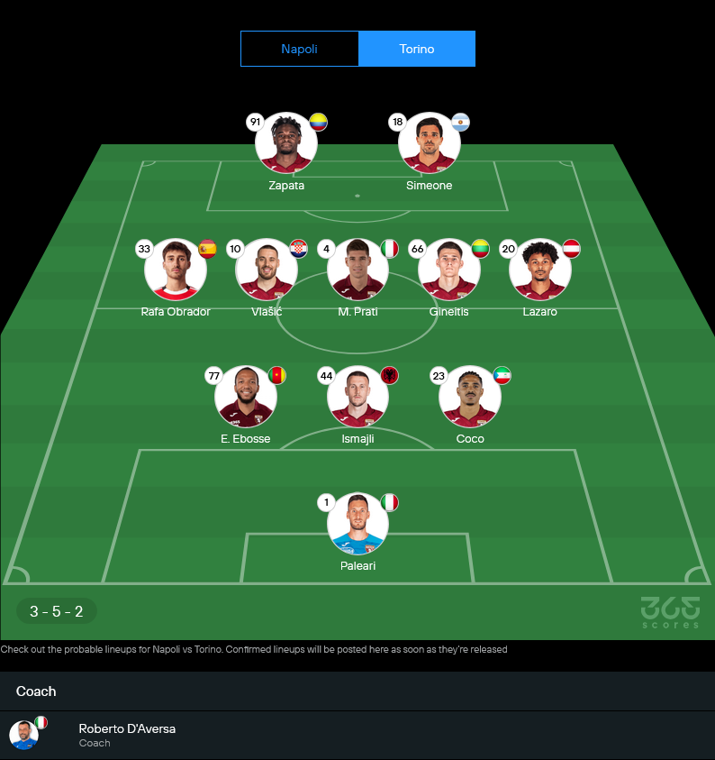 เกมนี้ภาพมันออกชัดว่า นาโปลีได้เปรียบทุกมุม ทั้งอันดับ ฟอร์มในบ้าน และความหลากหลายเกมรุก โตริโน่ช่วงหลังมีชนะให้เห็น แต่ยังเป็นทีมที่เวลาเจอคู่แข่งครองบอลจัด ๆ มักโดนบีบจนเตะทิ้งเตะขว้าง แล้วสุดท้ายก็กลับมารับเหนื่อยยาว ๆ