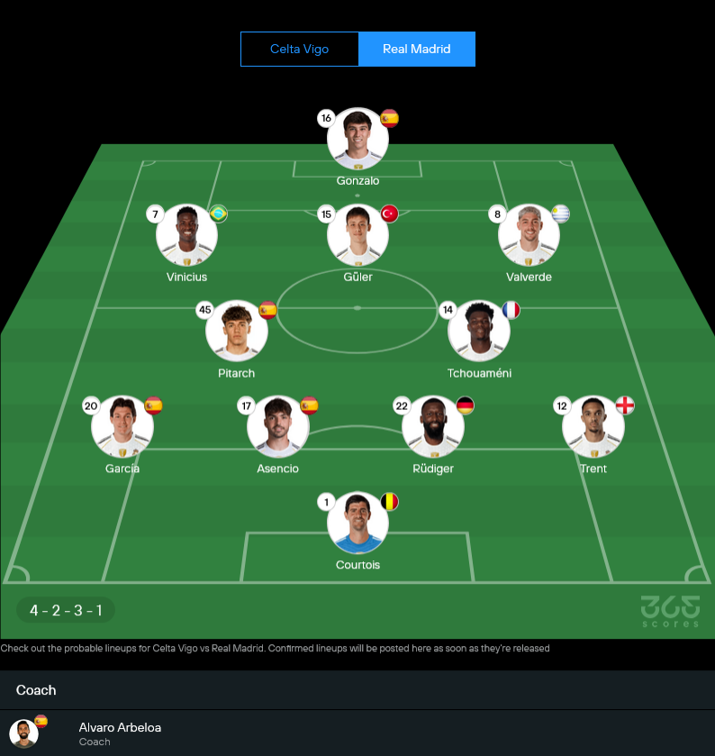 ฝั่งราชันภายใต้การคุมของ อัลบาโร่ อาร์เบลัว ต้องบอกว่า “งานเข้า” เพราะตัวเจ็บกับตัวแบนยาวเป็นหางว่าว แถมในลีกเพิ่งสะดุดต่อเนื่อง ทำให้เกมนี้ต้องเน้นความรัดกุมมากขึ้น เกมรุกยังมีวินิซิอุสเป็นตัวแบกหลัก ขณะที่แนวรับต้องจัดทดแทนหลายตำแหน่ง จุดนี้แหละที่ทำให้คู่นี้น่าลุ้น เพราะถ้าโดนเซลต้ากดจังหวะเพรสหนักๆ มาดริดมีสิทธิ์เสียรูปเกม