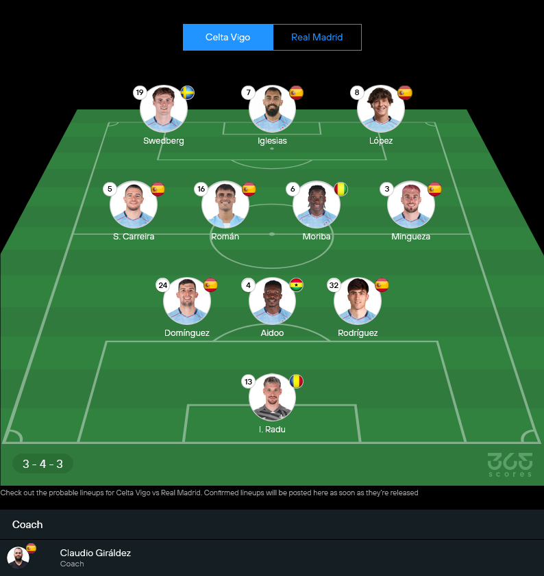 เซลต้าของ เคลาดิโอ กิรัลเดซ กำลังมาแบบต่อเนื่อง แกนหลักยังอยู่ครบเกือบหมด ข่าวดีคือ บอร์ฆ่า อิเกลเซียส พ้นโทษแบนกลับมาช่วยเกมรุก ทำให้การจัดทัพยืดหยุ่นขึ้น ส่วนรายชื่อสภาพร่างกายมีตัวที่ยังต้องเช็กความฟิต และมีแนวรับที่ไม่สมบูรณ์บางตำแหน่ง ทำให้เกมนี้พวกเขาน่าจะยืนระบบถนัด เน้นแพ็กกลางสนามแล้วฉวยจังหวะสวนกลับให้เฉียบ