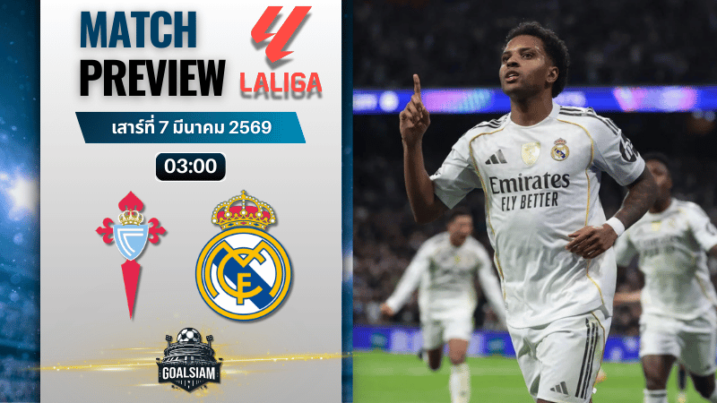 GOALSIAM บอกเลยคู่นี้กลิ่นดราม่ามาแต่ไกล ลาลีกาคืนวันเสาร์ที่ 7 มีนาคม 2569 เวลา 03:00 น. เซลต้า บีโก้ ทีมอันดับ 6 เปิดรังเอสตาดิโอ เด บาไลดอส รับมือ เรอัล มาดริด อันดับ 2 เกมนี้ภาพรวมชื่อชั้นราชันเหนือกว่าอยู่แล้ว แต่จังหวะบอลตอนนี้มันไม่ง่าย เพราะฝั่งเจ้าบ้านกำลังมั่นใจ ชนะรัวต่อเนื่อง เล่นในบ้านก็มีทีเด็ดดื้อๆ ส่วนมาดริดดันหลุดฟอร์มในลีก แถมรายชื่อเดี้ยงกับแบนอย่างยาว ทำให้เกมนี้ออกได้หลายหน้าสุดๆ ใครสายลุ้นต้องจับตาตั้งแต่ 15 นาทีแรกว่าจะกดกันแรงแค่ไหน