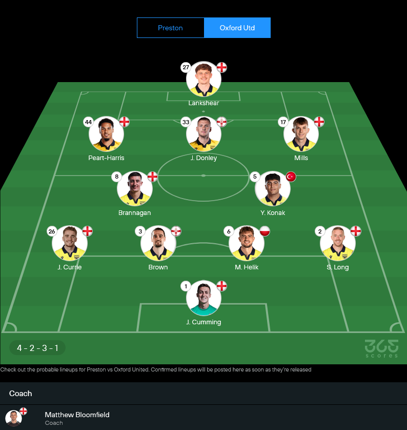 11 ตัวจริงคาดการณ์ อ็อกซ์ฟอร์ด ยูไนเต็ด (4-2-3-1)