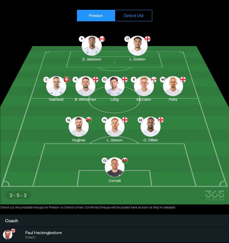 11 ตัวจริงคาดการณ์ เปรสตัน (3-5-2)