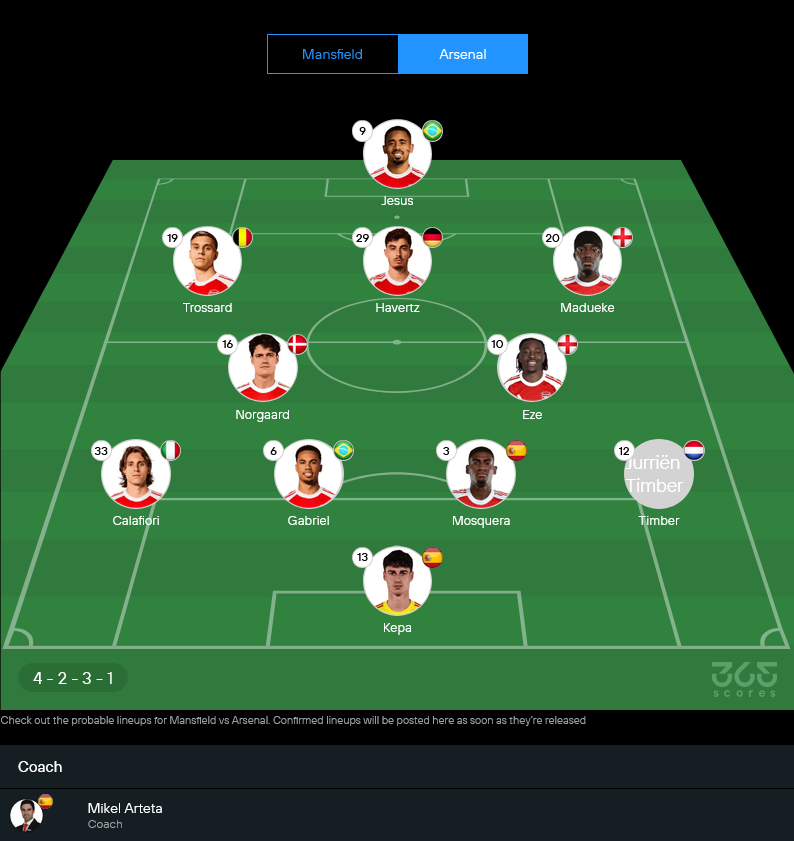 มิเกล อาร์เตต้าเกมนี้มีโอกาสหมุนทีม แต่รายชื่อคาดการณ์ที่ออกมายังโหดอยู่ดี และที่น่าสนใจคือภาพรวมเหมือนจะวาง 4-2-3-1 เพื่อให้แดนกลางคุมจังหวะเนียนๆ แล้วปล่อยให้ตัวรุกสายพลิ้วทำงานหลังหน้าเป้า