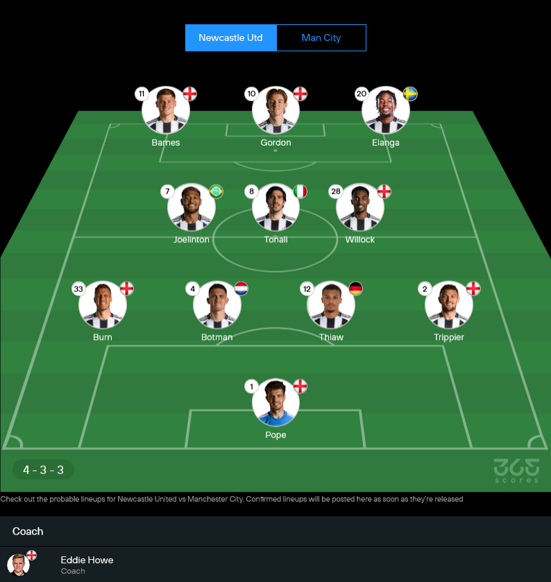 นิวคาสเซิ่ลของเอ็ดดี้ ฮาว เกมนี้ตัวเลือกไม่ได้เต็มมือเท่าไหร่ เพราะมีทั้งเจ็บ ทั้งเช็กฟิต และมีตัวโดนแบนด้วย ทำให้การจัดทีมต้อง “คิดเผื่อ” ตลอดเกม แต่ข้อดีคือระบบทีมยังชัด เล่น 4-3-3 ได้ดุดัน วิ่งบี้หนัก แล้วเน้นโจมตีจากริมเส้นเร็วๆ