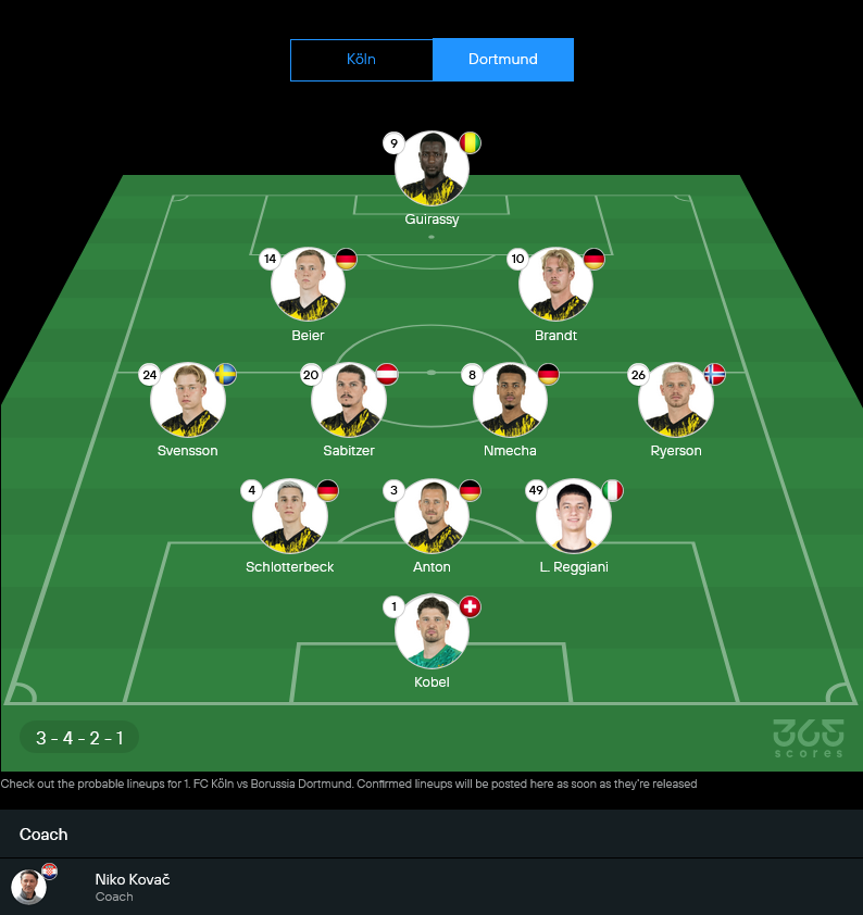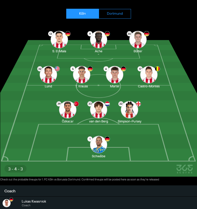 โคโลญจน์มาในทรง 3-4-3 ตามภาพรายชื่อคาดการณ์ แผงหลังยืนสามคนเน้นปะทะ กลางสี่คนต้องทำงานหนักทั้งไล่ทั้งซ้อน จุดสำคัญคือรายชื่อเจ็บเยอะ โดยตัวที่ “Out” มีหลายราย และยังมีพวก “Doubtful” ที่ต้องลุ้นความฟิตก่อนเตะ ทำให้เกมนี้โคโลญจน์อาจต้องเล่นแบบรัดกุมมากขึ้น แล้วฝากความหวังที่สามประสานแดนหน้าให้จบสกอร์ให้คมที่สุดตามสไตล์บอลรองบ้านๆ